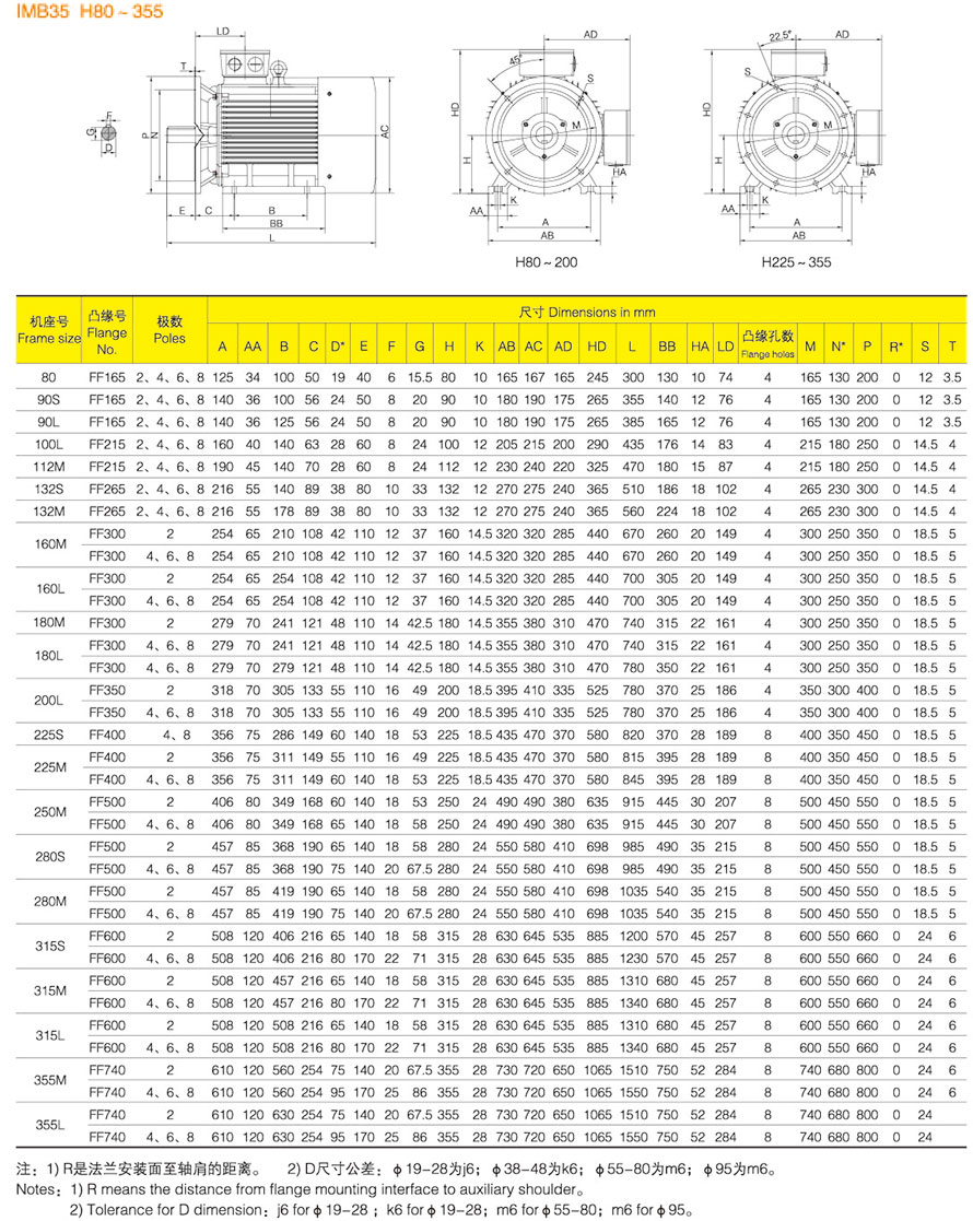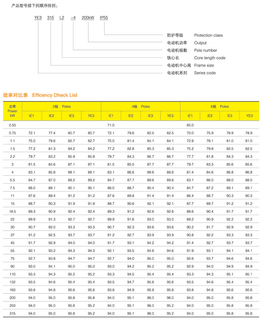 YE3系列電動機中心高從H80~355,功率從.75KW~315KW,級數(shù)為2、4、6。