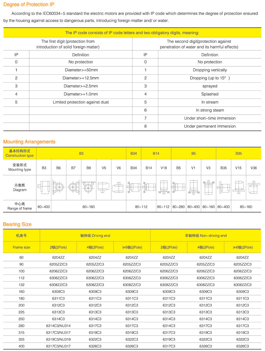 YE3 series motor protection grade is IP55, cooling method is IC411, installation size is in line with ICE standard. The rated voltage is 400V and the rated frequency is 50HZ. The working environment temperature does not exceed 40 ° C, and the altitude does not exceed 1000 meters. Working mode: continuous (S1).