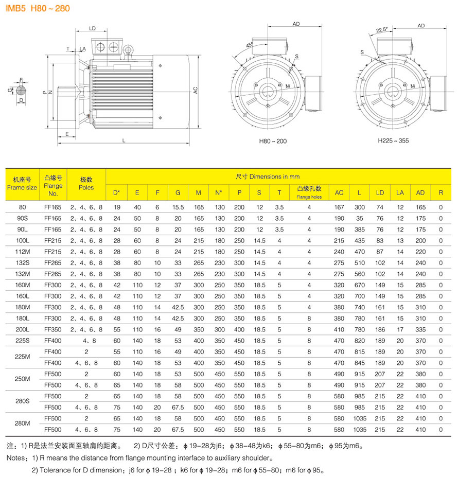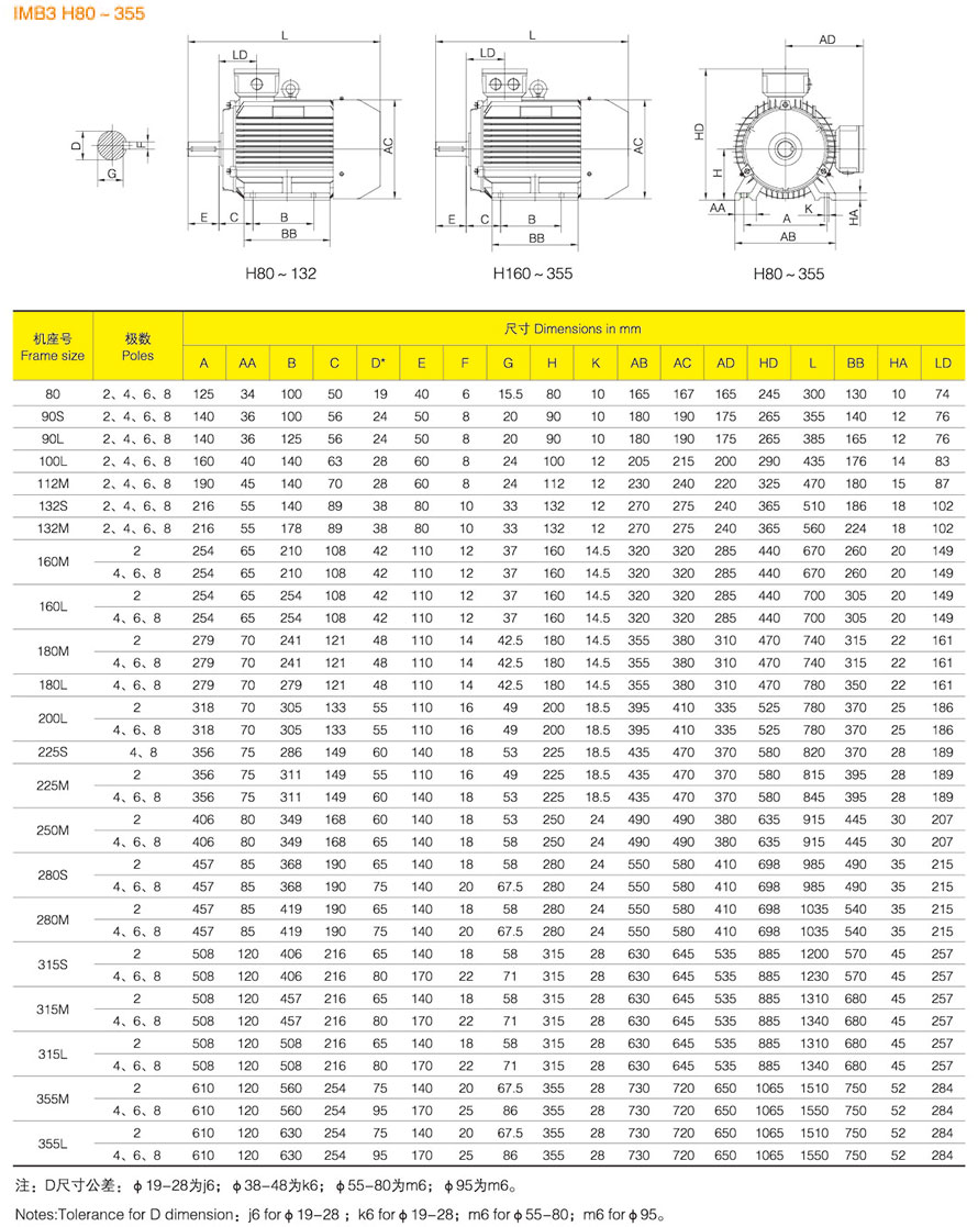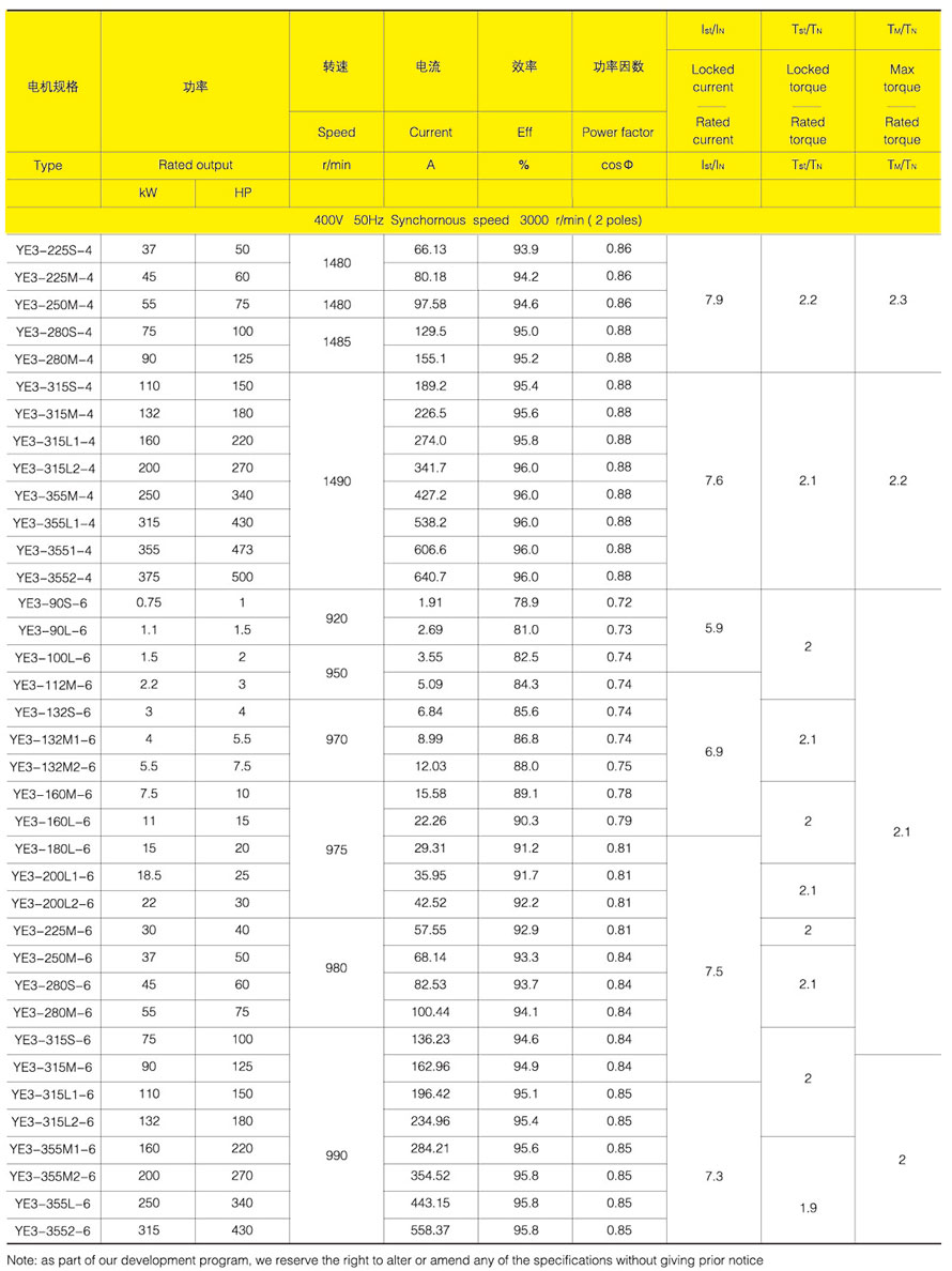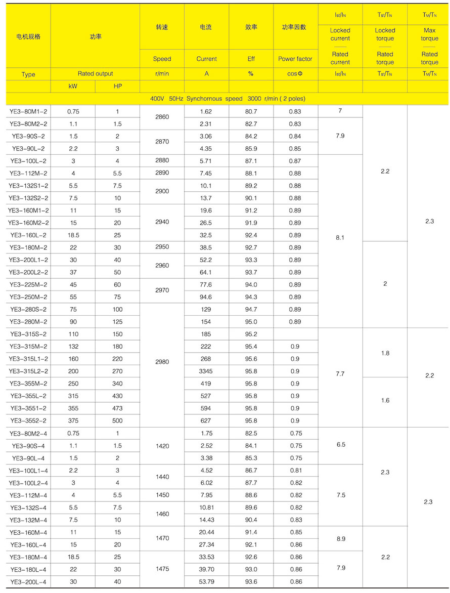 YE3 series motor center height from H80 ~ 355, power from .75KW ~ 315KW, the number of stages is 2, 4, 6.